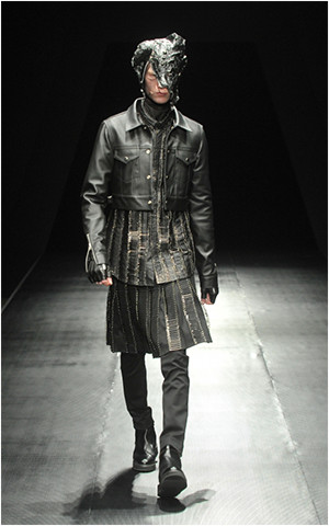 A men’s short jacket style that seems like it has been done, but hasn’t. Although the inner shirt is an aggressive item that uses a large amount of safety pins, I enjoy the balance between the luxury leather material and styling with a minimal feeling of class. This style allows you to feel a new approach to the punk style.