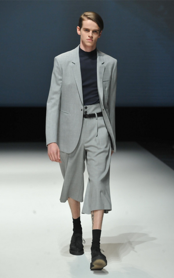 The setup style of the men’s high waist, high-necked collar, and tuck-in is contradictory with that of recent Tokyo street styles; you can really feel the strength of the brand intentions through these proposals. The color contrast of light gray and navy is great as well.